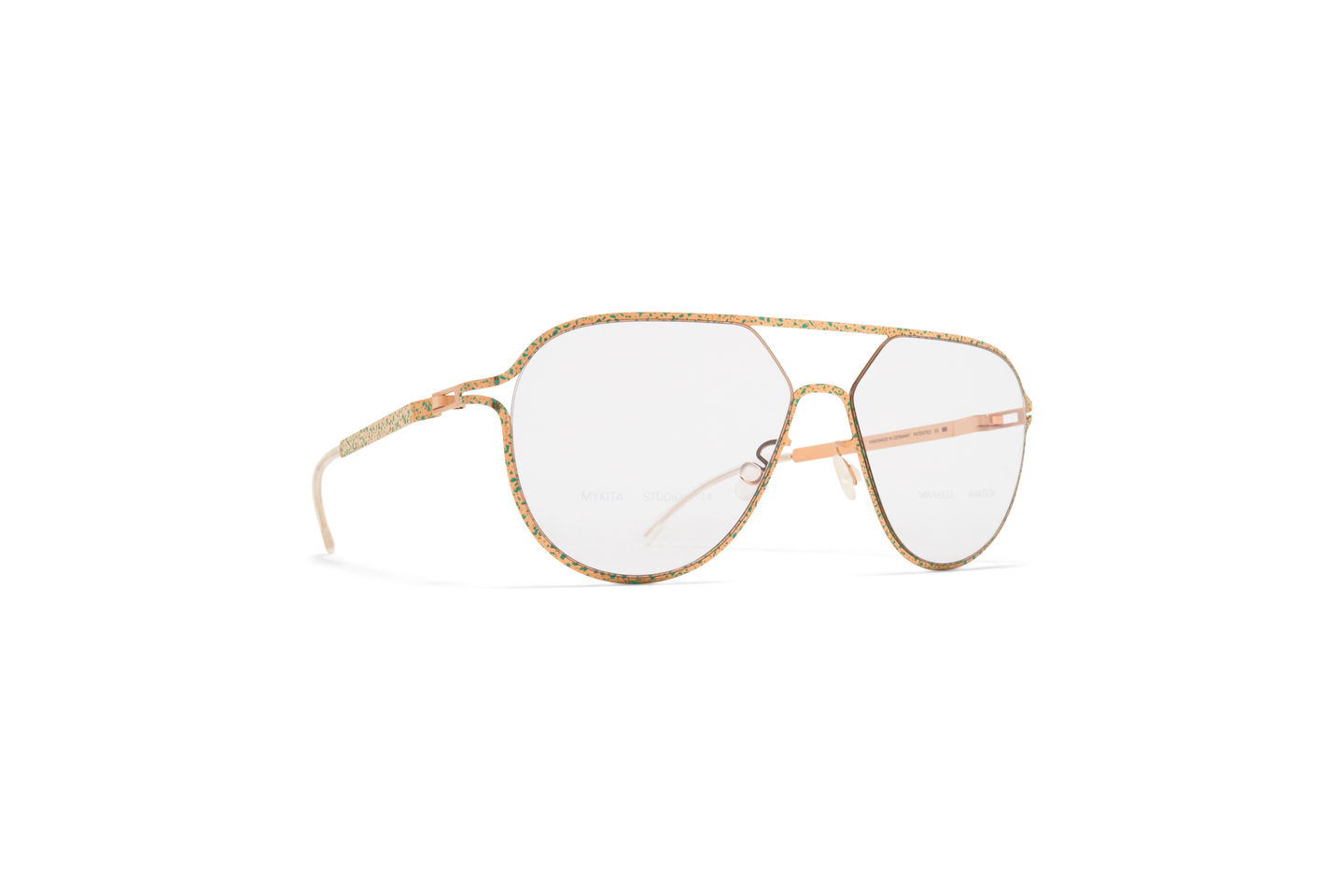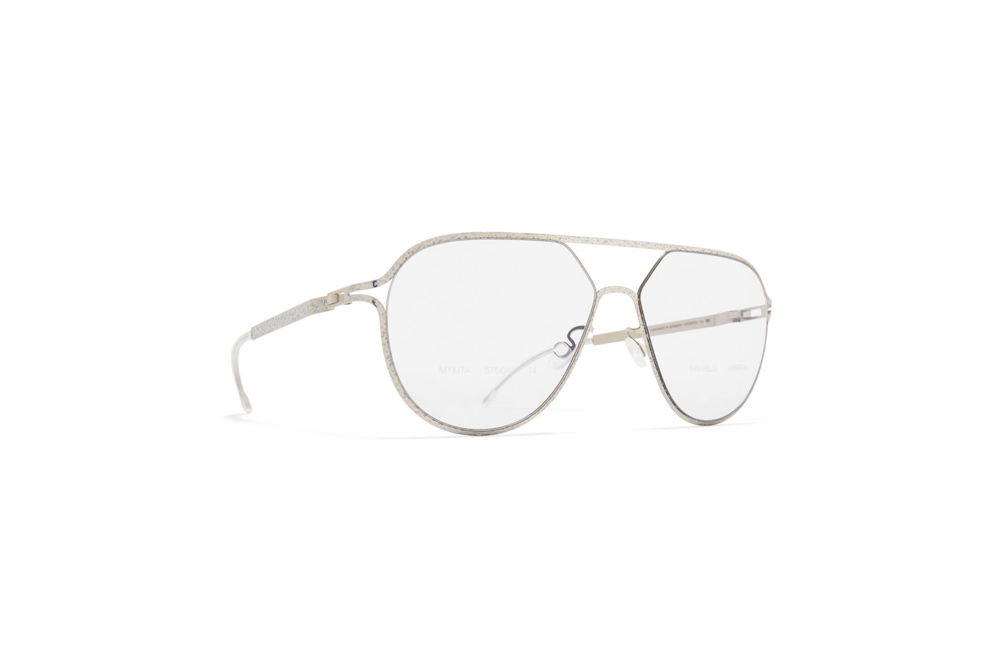 Κατασκευασμένο από ελαφρύ ανοξείδωτο ατσάλι, το STUDIO14.2 σε Silver/Pastel Grey Terrazzo με φακούς Gloomy Grey είναι ένας σκελετός γυαλιού ηλίου σε σχήμα aviator από τη συλλογή MYKITA STUDIO. Χειροποίητο στο Βερολίνο.