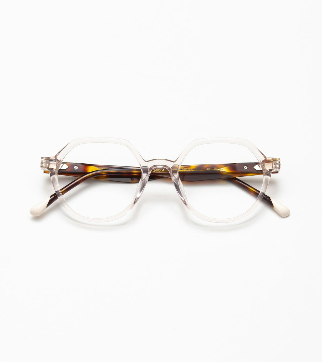 Στρογγυλός σχεδιασμός από ιταλική ακετάτη με μειωμένο μέγεθος για μικρά πρόσωπα. Οι βραχίονες από ακετάτη διαθέτουν επένδυση στις άκρες και γερμανικούς μεντεσέδες OBE Spike.