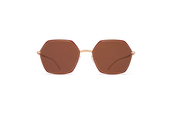 Made of lightweight stainless steel, TILLA in Champagne Gold/Cranberry with Brown Solid lenses is a square shaped sunglass frame from the MYKITA DECADES collection with a geometric rim design. Handcrafted in Berlin.