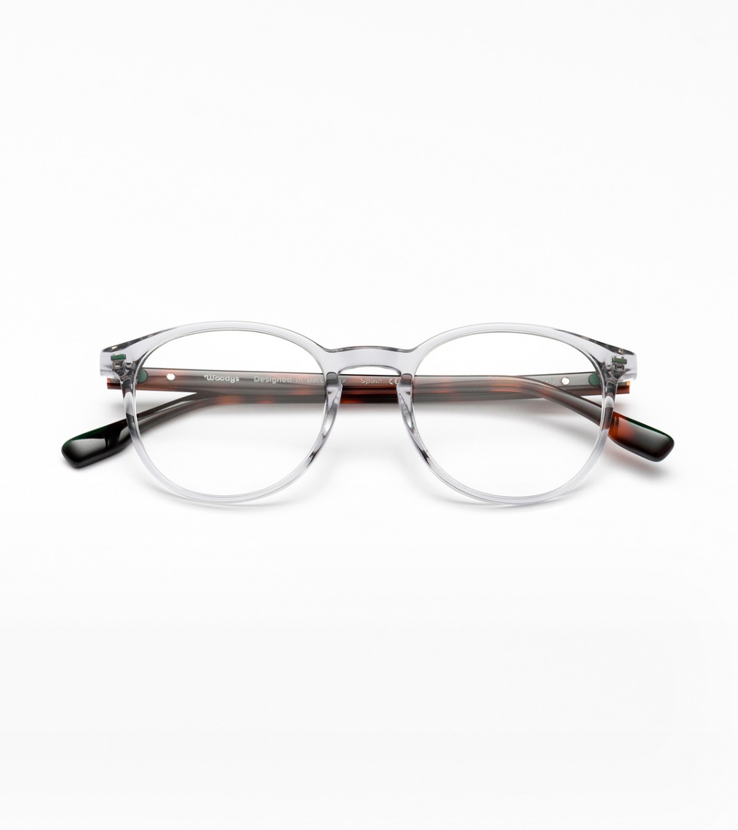 Italian acetate model with metal inlays on the front. Acetate temples with engraved metal core and wood inlay on the temple tips.
