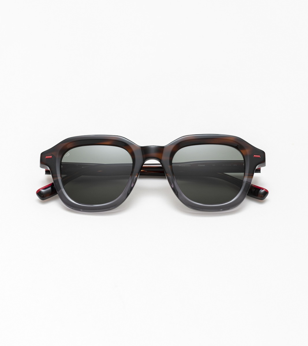 Italian acetate frame featuring milled details. Temples with engraved metal core. CR39 polarized lenses with high ultraviolet protection produced by Carl Zeiss Vision.