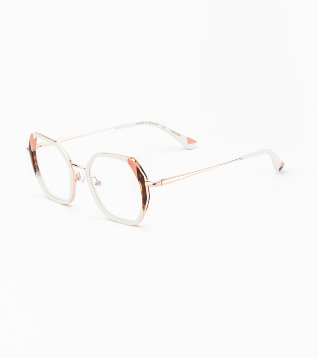 Paola is a triple laminated acetate and metal combined frame in a hexagonal shape with silicon nose pads. Temple tips are all made of acetate with a different colored acetate detail at the end and a wood inlay.